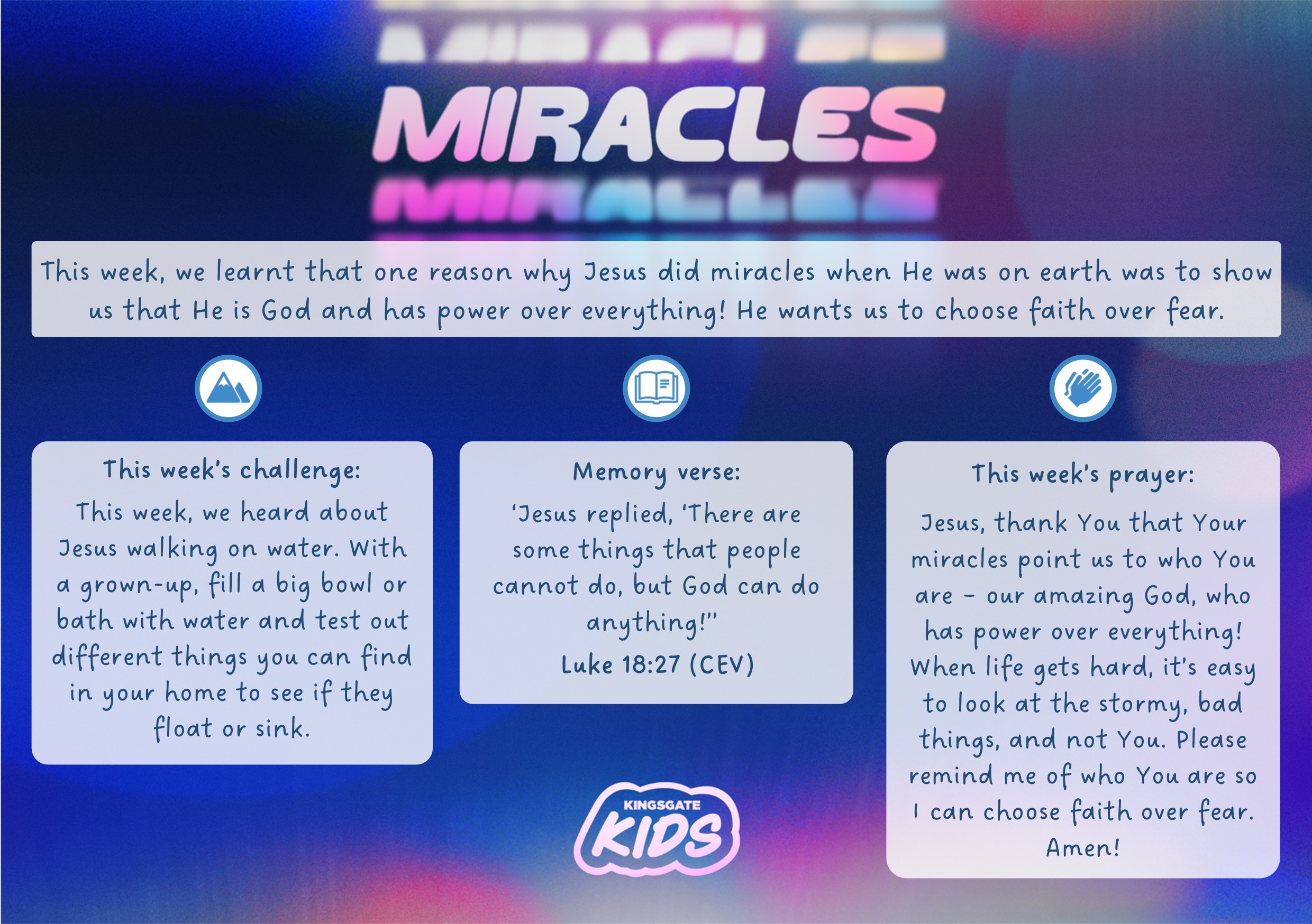 Jesus, thank You that Your miracles point us to who You are – our amazing God, who has power over everything! When life gets hard, it’s easy to look at the stormy, bad things, and not You. Please remind me of who You are so I can choose faith over fear.